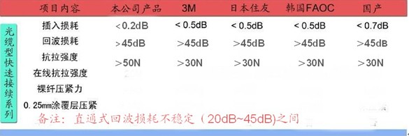 展(zhan)通(tong)現(xian)場(chang)組(zu)裝(zhuang)型(xing)連(lian)接(jie)器(qi)通(tong)過(guo)不(bu)同(tong)條(tiao)件(jian)下(xia)的(de)嚴(yan)格(ge)測(ce)試(shi),各(ge)種(zhong)性(xing)能(neng)指(zhi)標(biao)與(yu)許(xu)多(duo)國(guo)外(wai)知(zhi)名(ming)品(pin)牌(pai)同(tong)類(lei)產(chan)品(pin)相(xiang)當(dang),特(te)別(bie)是(shi)主(zhu)要(yao)性(xing)能(neng)指(zhi)標(biao)還(hai)遠(yuan)高(gao)於(yu)其(qi)他(ta)產(chan)品(pin)。其(qi)主(zhu)要(yao)性(xing)能(neng)比(bi)較(jiao)如(ru)下(xia):