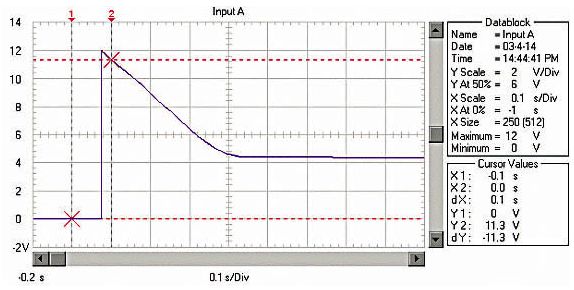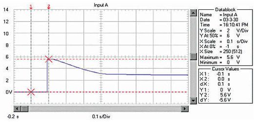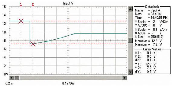 由於RM、RB、RL均非常低,啟動電流非 常大。例如用12V、45Ah的蓄電池啟動安裝1.9升柴油機的汽車,蓄電池的電壓在啟動瞬間由12.6V降到約3.6V!啟動過程的蓄電池電壓波形如圖 1;啟動瞬時的電流達550A,約為蓄電池的12C的放電率!啟動過程的蓄電池電流波形如圖2,(電流傳感器的電流/電壓變換比率:100A/V)。盡管 車用蓄電池是啟動專用蓄電池,可以高倍率放電,但在圖1中可以看出,10倍以上的高倍率放電時的蓄電池性能變得很差,而且,如此高倍率放電對蓄電池的損傷 也是非常明顯的。啟動過程的電壓劇烈變化也是極強的電磁幹擾,可以造成電氣設備的“掉電”,poshidianqishebeizaifadianjiqidongguochengjieshuhouzhongxinshangdian,jisuanjizaizhegeguochengzhongfeichangrongyisiji。yinci,wulunconggaishanqichedianqishebeidediancihuanjinghaishigaishanqichedeqidongxingnenghexudianchidexingneng、延長使用壽命來考慮,改善汽車電源在啟動過程的性能是必要的。