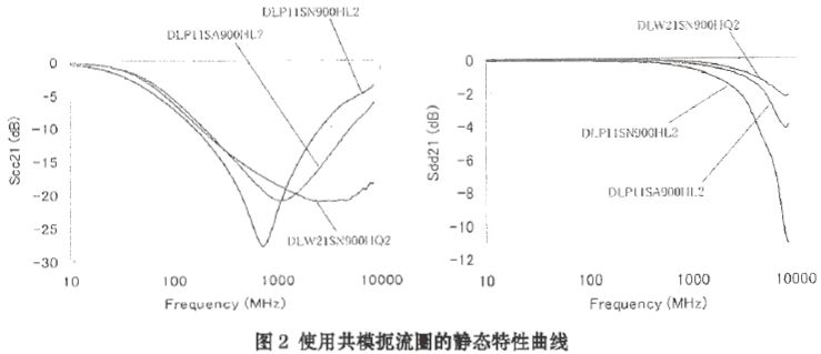 現在把共模扼流圈在信號線上和時鍾線上測試其噪音並因此確定受到的影響。在1080p或12位深色的最高信號頻率為1.11GHz上,對數據傳輸進行評價。圖2所示為共模轉換特性,特別是Scc21,在此消除的噪音但增加了與其成比例的Scc21的量值,以及差分模式傳輸特性和影響信號波形跌幅成比例的Sdd21。在此采用共模扼流圈進行評價。