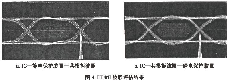 根據以上所述的評價模式,確定在HDMI1.3版本或12位深色信號的有效噪音抑製措施和方法,並給予了實施。首先,共模扼流圈的Scc21值要高,用來抑製GHz頻段的噪音,而且在3GHz或以上頻率時,Scc21要高於10db。其次,共模扼流圈的截止頻率應高於或等於3.0GHz,以確保足夠的眼圖信號空間。最後,為了確保抗靜電功能,貼裝順序應先安裝接口,接著安裝ESD器件,最後安裝共模扼流圈。但是,阻抗匹配將變得更困難,這是必須注意的問題。