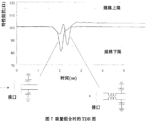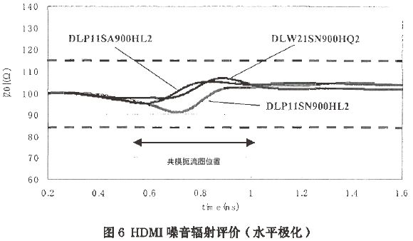 圖6所示的是用一個TDR測量儀器測試共模扼流圈的阻抗。零件的阻抗等於傳輸線的特性阻抗。為了使傳輸信號沒有輻射,阻抗匹配是必須的。圖6同時也顯示了共模扼流圈用於阻抗匹配的評價,符合HDMI標準要求的100+/-15Ω。由於使用了一個ESD器件的電容器,有時會造成阻抗不能滿足標準的需要。在這種情況下,用共模扼流圈加ESD壓敏電阻就可以滿足阻抗匹配標準了。圖7所示為在HDMI接口和1.0PF電容的ESD壓敏電阻之間加一個DLP11SN900HL2的阻抗情況。此時的阻抗已經滿足阻抗匹配標準了。