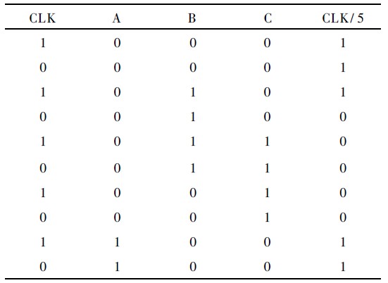 采用基於D 觸發器結構的五分頻器邏輯框圖如圖1所示。圖1 由3 個D 觸發器和少量邏輯門構成, 采用了同步工作模式, 其原理是由吞脈衝計數原理產生2 個占空比不同的五分頻信號A 和B, 然後對時鍾信號CLK, A 和B 進行邏輯運算得到占空比為50% 的五分頻信號CLK/ 5, 其計數過程如表1 所示, 從表1 的計數過程可知, 分頻後的時鍾CLK/ 5 的周期是輸入時鍾CLK 的5 倍, 由此實現了五分頻並且其占空比為50% .