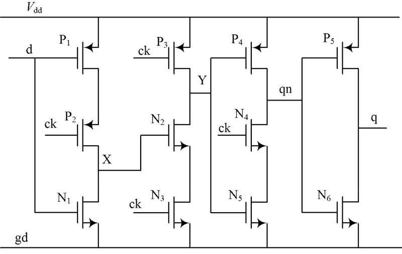 TSPC 電路構成的觸發器如圖3 所示, 由圖中可以看出, 該電路由四級反相器構成, 上升沿觸發, 當CK 為低電平, 輸入反相器在節點X 上采樣反向d 輸入,第2 級反相器處於保持狀態, 節點Y 預充電至V dd,第三級反相器處於保持狀態, 時鍾上升沿來時, 第二級反相器求值, Y 的電平值發生變化, 時鍾ck 為高電平時,節點Y 的值傳送到輸出q, 該觸發器的延時為4 個反相器的傳播延時, 由於電路中元件數目很少, 而且采用動態邏輯, 因此功耗極低。