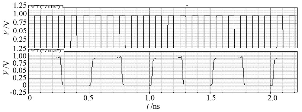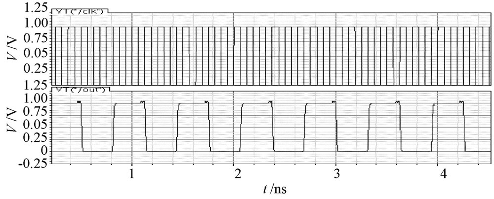 采用Cadence 公司的spect re 仿真器對設計的分頻器分別仿真, 仿真電源電壓為1 V, 結果表明: 在典型工藝參數條件下,基於CML 電路結構的五分頻器最大工作頻率是8 GHz, 最小工作頻率是1 kHz, 當工作在8 GHz 時, 功耗為1. 7 mW, 輸出信號占空比為49. 76% ; 基於T SPC 電路結構的五分頻器最大工作頻率是10 GHz, 最小工作頻率是10 MHz, 當工作在10 GH z時, 功耗采用10 ns 內的平均功耗, 功耗為0. 2 mW, 輸出信號占空比為49. 92%.由於是單端輸入輸出, 基於T SPC 電路結構的分頻器抗噪聲能力較弱。最高工作頻率下的仿真結果如圖4, 圖5 所示。