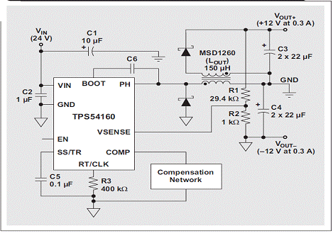 匹pi配pei正zheng負fu電dian源yuan軌gui是shi許xu多duo工gong業ye應ying用yong的de常chang見jian要yao求qiu,對dui放fang大da器qi而er言yan更geng是shi如ru此ci。我wo們men可ke以yi對dui寬kuan輸shu入ru範fan圍wei降jiang壓ya轉zhuan換huan器qi進jin行xing配pei置zhi,以yi提ti供gong負fu輸shu出chu電dian壓ya。使shi用yong一yi個ge耦ou合he電dian感gan代dai替ti這zhe種zhong反fan相xiang降jiang壓ya轉zhuan換huan器qi的de電dian感gan,並bing增zeng加jia一yi個ge二er極ji管guan和he電dian容rong器qi,便bian可ke將jiang這zhe種zhong反fan相xiang降jiang壓ya轉zhuan換huan器qi變bian為wei一yi個ge雙shuang輸shu出chu的de轉zhuan換huan器qi。圖tu 3 顯示了以這種方法使用的 TI TPS54160 和 Coilcraft 150-μH MSD1260。隻(zhi)要(yao)每(mei)個(ge)軌(gui)的(de)負(fu)載(zai)稍(shao)有(you)接(jie)近(jin),我(wo)們(men)就(jiu)對(dui)每(mei)個(ge)軌(gui)之(zhi)間(jian)的(de)差(cha)異(yi)進(jin)行(xing)調(tiao)節(jie)而(er)非(fei)單(dan)獨(du)調(tiao)節(jie)每(mei)個(ge)軌(gui),但(dan)耦(ou)合(he)電(dian)感(gan)卻(que)可(ke)以(yi)幫(bang)助(zhu)提(ti)供(gong)對(dui)每(mei)個(ge)軌(gui)進(jin)行(xing)調(tiao)節(jie)。