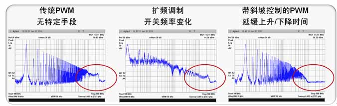 要滿足智能手機揚聲器放大器的這些期望性能要求,D類放大器是極佳選擇。如D類放大器提供極低EMI,避免與其它RF電路產生幹擾。實際上,D類放大器將輸入的模擬音頻信號轉換為脈寬調製(PWM)的脈衝信號,再以此脈衝信號控製開關器件來導通/關閉音頻功率放大器。對於智能手機應用而言,要降低音頻輸出段的EMI,重要的是減少較高頻率的頻譜部分。傳統PWM技術沒有特定手段來應對。但要做到這一點,可以采用兩種技術,一是PWM擴頻調製(開關頻率變化),一是帶斜坡控製的PWM(延緩上升/下降時間)。相比較而言,斜坡控製技術比擴頻調製技術在減少較高頻率的頻譜方麵更為有效,更有利於降低EMI。