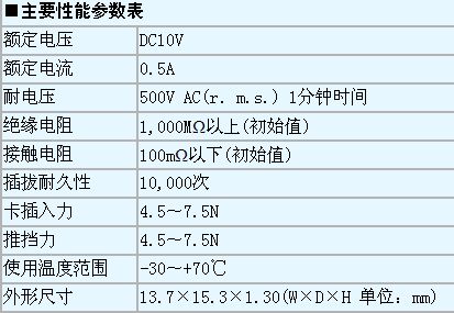 “CIM-J38N”連接器采用了小型、薄型設計,標準安裝型的物理尺寸為高1.30mm、寬13.7mm、進深15.3mm。連接器采用Push-in Push-out推擋方式,卡排出尺寸為3.8mm。同時還附帶防卡彈出止動結構、裝載卡檢測開關(Normally open型)、RFID接頭,並增強了卡反向插入功能。另外還增強了EMI對策用接地線(Ground)功能。