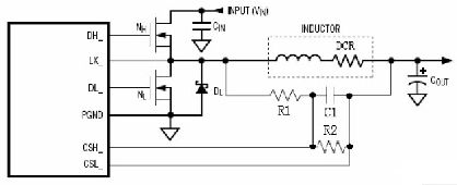 由(you)於(yu)輸(shu)出(chu)電(dian)壓(ya)低(di),那(na)麼(me)電(dian)流(liu)比(bi)較(jiao)器(qi)的(de)兩(liang)個(ge)輸(shu)入(ru)管(guan)腳(jiao)的(de)共(gong)模(mo)電(dian)壓(ya)較(jiao)低(di),因(yin)此(ci)可(ke)以(yi)使(shi)用(yong)低(di)輸(shu)入(ru)共(gong)模(mo)電(dian)壓(ya)的(de)差(cha)動(dong)放(fang)大(da)器(qi),提(ti)高(gao)電(dian)流(liu)檢(jian)測(ce)的(de)精(jing)度(du),降(jiang)低(di)噪(zao)聲(sheng)。這(zhe)種(zhong)配(pei)置(zhi)另(ling)一(yi)個(ge)大(da)的(de)優(you)點(dian)是(shi)可(ke)以(yi)使(shi)用(yong)電(dian)感(gan)的(de)DCR作為電流檢測電阻。要注意的是,在電感值和飽和電流滿足整個輸入電壓範圍和輸出負載電流範圍的前提下,對電感的DCR有一定的限製,因而在一些應用中需要定製電感。此外,電流比較器的輸入阻抗要大,兩個輸入管腳的偏置電流要小,從而提高使用DCR作為電流檢測電阻時的檢測精度。相關的濾波元件也在設計作相應的匹配,如下圖所示。