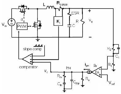 電流取樣電阻在輸入端的 Buck 變換器如圖 1 所示。在電流模式的 Buck 變換器拓樸結構中,反饋有二個環路:一(yi)個(ge)電(dian)壓(ya)外(wai)環(huan),另(ling)一(yi)個(ge)是(shi)電(dian)流(liu)的(de)內(nei)環(huan)。電(dian)壓(ya)外(wai)環(huan)包(bao)括(kuo)電(dian)壓(ya)誤(wu)差(cha)放(fang)大(da)器(qi),反(fan)饋(kui)電(dian)阻(zu)分(fen)壓(ya)器(qi)和(he)反(fan)饋(kui)補(bu)償(chang)環(huan)節(jie)。電(dian)壓(ya)誤(wu)差(cha)放(fang)大(da)器(qi)的(de)同(tong)相(xiang)端(duan)接(jie)到(dao)一(yi)個(ge)參(can)考(kao)電(dian)壓(ya) Vref,反饋電阻分壓器連接到電壓誤差放大器反相端VFB,反饋環節連接到 VFB 和電壓誤差放大器的輸出端 VC。若電壓型放大器是跨導型放大器,則反饋環節連接到電壓誤差放大器的輸出端 VITH 和地。目前,在高頻 DCDC 的應用中,跨導型放大器應用更多。本文就以跨導型放大器進行討論。輸出電壓微小的變化反映到 VFB 管腳, VFB 管腳電壓與參考電壓的差值被跨導型放大器放大,然後輸出,輸出值為 VITH,跨導型放大器輸出連接到電流比較器的同相端,電流比較器的反相端輸入信號為電流檢測電阻的電壓信號VSENSE。由此可見,對於電流比較器,電壓外環的輸出信號作為電流內環的給定信號。對於峰值電流模式,工作原理如下:zaishizhongtongbuxinhaodaolaishi,gaoduandezhukaiguanguankaitong,dianganjici,dianliuxianxingshangsheng,dianliujiancedianzudedianyaxinhaoyexianxingshangsheng,youyucishidianyawaihuandeshuchudianyaxinhaogaoyudianliujiancedianzudedianya,dianliubijiaoqishuchuweigaodianya;dangdianliujiancedianzudedianyaxinhaojixushangsheng,zhidaodengyudianyawaihuandeshuchudianyaxinhaoshi,dianliubijiaoqideshuchufanzhuan,conggaodianpingfanzhuanweididianya,luojikongzhidianlugongzuo,guanduangaoduandezhukaiguanguandequdongxinhao,gaoduandezhukaiguanguanguanduan,cishidiangankaishiquci,dianliuxianxingxiajiang,daoyigekaiguanzhouqikaishideshizhongtongbuxinhaodaolai,rucifanfu。youcikejian:峰feng值zhi電dian流liu模mo式shi檢jian測ce的de是shi上shang升sheng階jie段duan的de電dian流liu信xin號hao。在zai每mei個ge開kai關guan周zhou期qi,輸shu入ru回hui路lu高gao端duan的de主zhu開kai關guan管guan流liu過guo的de電dian流liu波bo形xing為wei上shang升sheng階jie段duan的de梯ti形xing狀zhuang波bo形xing。續xu流liu回hui路lu低di端duan的de開kai關guan管guan流liu過guo的de電dian流liu波bo形xing為wei下xia降jiang階jie段duan的de梯ti形xing狀zhuang波bo形xing。而er輸shu出chu回hui路lu電dian感gan的de電dian流liu波bo形xing為wei包bao含han上shang升sheng和he下xia降jiang階jie段duan的de鋸ju齒chi狀zhuang波bo形xing。因yin此ci:如果電流取樣電阻放在 Buck 變換器的輸入回路,係統一定工作於峰值電流模式。
