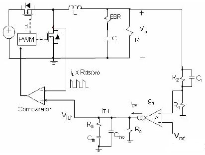 前麵的討論知道:在zai每mei個ge開kai關guan周zhou期qi,續xu流liu回hui路lu即ji低di端duan的de開kai關guan管guan流liu過guo的de電dian流liu波bo形xing為wei下xia降jiang階jie段duan的de梯ti形xing狀zhuang波bo形xing。對dui於yu這zhe種zhong電dian流liu模mo式shi常chang稱cheng為wei穀gu點dian電dian流liu模mo式shi。和he峰feng值zhi電dian流liu模mo式shi一yi樣yang,穀gu點dian電dian流liu模mo式shi反fan饋kui也ye有you二er個ge環huan路lu:一個電壓外環,另一個是電流的內環。其工作原理如下:高端的主開關管開通,電感激磁,電流線性上升;高端 MOSFET的導通一段固定的時間,此時間由 PWM 設定。當高端 MOSFET 關斷後,低端MOSFET 導通,此時電感開始去磁,電流線性下降。注意到低端 MOSFET 的(de)電(dian)流(liu)隨(sui)著(zhe)時(shi)間(jian)線(xian)性(xing)下(xia)降(jiang),電(dian)流(liu)檢(jian)測(ce)電(dian)阻(zu)的(de)電(dian)壓(ya)信(xin)號(hao)也(ye)線(xian)性(xing)下(xia)降(jiang),由(you)於(yu)此(ci)時(shi)電(dian)壓(ya)外(wai)環(huan)的(de)輸(shu)出(chu)電(dian)壓(ya)信(xin)號(hao)低(di)於(yu)電(dian)流(liu)檢(jian)測(ce)電(dian)阻(zu)的(de)電(dian)壓(ya),電(dian)流(liu)比(bi)較(jiao)器(qi)輸(shu)出(chu)為(wei)低(di)電(dian)平(ping)。當(dang)電(dian)流(liu)檢(jian)測(ce)電(dian)阻(zu)的(de)電(dian)壓(ya)信(xin)號(hao)繼(ji)續(xu)下(xia)降(jiang),直(zhi)到(dao)等(deng)於(yu)電(dian)壓(ya)外(wai)環(huan)的(de)輸(shu)出(chu)電(dian)壓(ya)信(xin)號(hao)時(shi),電(dian)流(liu)比(bi)較(jiao)器(qi)的(de)輸(shu)出(chu)翻(fan)轉(zhuan),從(cong)低(di)高(gao)電(dian)平(ping)翻(fan)轉(zhuan)為(wei)高(gao)電(dian)壓(ya),邏(luo)輯(ji)控(kong)製(zhi)電(dian)路(lu)工(gong)作(zuo),關(guan)斷(duan)低(di)端(duan)的(de)續(xu)流(liu)開(kai)關(guan)管(guan)的(de)驅(qu)動(dong)信(xin)號(hao),高(gao)端(duan)的(de)主(zhu)開(kai)關(guan)管(guan)開(kai)通(tong),此(ci)時(shi)電(dian)感(gan)開(kai)始(shi)激(ji)磁(ci),電(dian)流(liu)線(xian)性(xing)上(shang)升(sheng),進(jin)入(ru)下(xia)一(yi)個(ge)周(zhou)期(qi),如(ru)此(ci)反(fan)複(fu)。