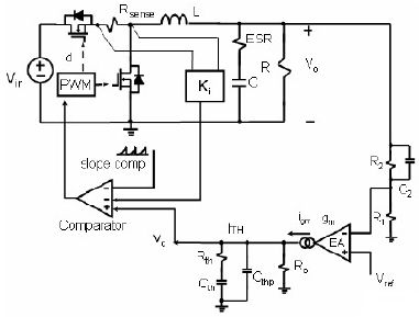穀點電流模式具有寬輸入電壓、低占空比、易檢測電流和快速負載響應。在占空比小於 50%shixuyaoxiepobuchang。fuzaixiangyingkuaisudeyuanyinzaiyugudiandianliumoshicongdangqiandemaichongzhouqixiangying,erfengzhidianliumoshicongxiayigemaichongzhouqixiangying。dangshuruheshuchudianyabianhuashi,ruogaoduan MOSFET 的導通的時間固定不變化,那麼係統將工作在變頻模式,不利於電感的優化工作。因此在 PWM 內部需要一個前饋電路,使高端 MOSFET 的(de)導(dao)通(tong)時(shi)間(jian)隨(sui)輸(shu)入(ru)電(dian)壓(ya)成(cheng)反(fan)比(bi)的(de)變(bian)化(hua),隨(sui)輸(shu)出(chu)電(dian)壓(ya)成(cheng)正(zheng)比(bi)的(de)變(bian)化(hua),從(cong)而(er)維(wei)持(chi)在(zai)輸(shu)入(ru)電(dian)壓(ya)變(bian)化(hua)和(he)負(fu)載(zai)變(bian)化(hua)時(shi),變(bian)換(huan)器(qi)近(jin)似(si)的(de)工(gong)作(zuo)於(yu)定(ding)頻(pin)方(fang)式(shi)。