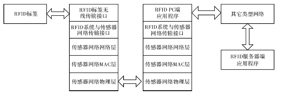 圖3 給出了WSN 與RFID 的融合方案協議層結構示意圖,顯示了兩者融合的可行性和價值所在,無線傳感器網絡與RFID 係統相結合,將RFID 的識別信息通過WSN 網絡,傳輸到RFID 服務器或其他網絡。