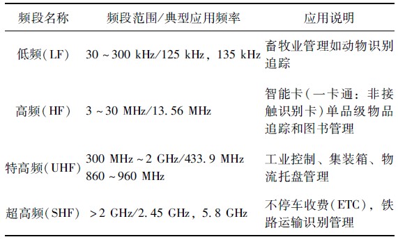 典型的RFID 係統一般由閱讀器、電子標簽、RFID 中間件及應用軟件係統3 部分組成。閱讀器與標簽建立雙向通信,通常由射頻接口、邏輯控製單元和天線3 部分組成; 標簽用於存儲所標識物品的身份和屬性信息,屬於被識別物品的標識設備,通常附著在被識別物品表麵或內部,是RFID 係統的電子數據載體,由MCU、耦合線圈、整流濾波電路和自耦變壓器構成; yueduqinenggouzaiduquxinxihoujiangxiancundebeibiaoshiwupindexinxitonggaogeilingyigexitong,zhegexitongtongchangyunxingyizhongruanjian,gairuanjianzaiyueduqiheyingyongcengmianzhijian,tongchangbeichengweiRFID 中間件。中間件是連接RFID設備和企業應用程序的紐帶,也是RFID 係統的核心,中間件將基於不同平台、不同需求的應用環境與RFID 物理設備連接起來,並提供合適的接口使之能夠進行數據交換。根據RFID 係統中射頻信號耦合方式的不同可分為電感耦合和電磁反向散射耦合方式,電感耦合方式一般適合於中、低頻工作的近距離射頻識別係統。電磁反向散射耦合方式一般適合於特高頻、超高頻工作的長距離射頻識別係統,具體應用如表1 所示。
