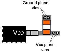 通過將電容的電源端直接連接至器件的電源端,然後經過孔連至Vcc層,在器件上安裝小容量的0.1μF或0.01μF旁路電容。經數個過孔將電容接地端連接至接地層(請參見圖6)。