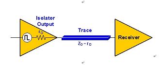 受控阻抗傳輸線是特性阻抗Z0始終受控於其幾何特性的走線。走線長度大於15mm(tr=1ns)和 30mm(tr=2ns)時,走線阻抗必須要與隔離器輸出阻抗Z0~rO匹配(如圖4所示),使信號反射最小化。這被稱為源阻抗匹配。