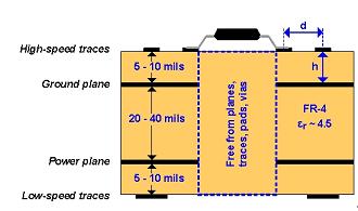 要實現低電磁幹擾(EMI)的PCB設計,這裏推薦一個最少四層的設計實例(請參見圖3),其從上到下分別為:高速信號層、接地層、電源層以及低頻信號層。