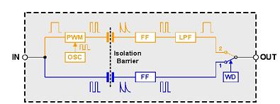 低速路徑比高速路徑多出幾個功能元件。因為低頻輸入信號要求隔離勢壘禁止采用大電容,所以輸入信號被用於對內部振蕩器(OSC)的載波頻率進行脈寬調製(PWM)。這就構成了一個非常高的頻率,能夠通過該電容勢壘。由於輸入得到了調製,因此必須在實際數據傳輸至輸出端以前使用低通濾波器(LPF)去除其中的高頻載波。