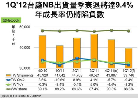 2012年第1季進入歐美傳統淡季,亞洲傳統旺季需求亦不甚熱絡,加上硬盤缺貨在1月最為嚴重,2月之後雖可逐月顯著改善,但英特爾(Intel)新CPU Ivy Bridge NB 4月上市在即,台廠於3月即將開始大量出貨,致使1月硬盤未能滿足的舊CPU NB訂單將不具補單意義,進而造成台廠NB出貨量將再較上季衰退9.4%。也由於全球景氣不振,NB市況持續低迷,DIGITIMES Research資深分析師兼主任簡佩萍預估,第1季台廠NB出貨量將再較2011年同期衰退3.2%,致使連續兩年第1季台廠NB出貨量年成長率均為負值。
