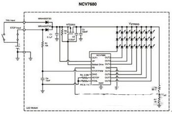 NCV7680集成了眾多功能,支持兩個亮度等級,一級用於停車,另一級用於尾部照明。如果需要,也可使用可選的脈寬調製(PWM)控製。係統設計人員隻需使用一個外部電阻設定輸出電流(整體設定點)。另外,針對要求大電流的設計,可選的外部鎮流器場效應晶體管(FET)可以根據設計所需的高電流進行功率分配。延遲的功率極限降低了在過電壓狀態下的驅動電流。這對於沒有外部FET的低電流應用來說十分重要。