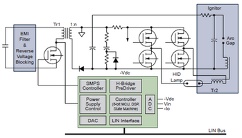 安森美半導體的全功能高強度放電(HID)(或氙燈)專用集成電路有助於改善前燈係統的性能。相對於傳統的鹵素燈,HID改善了顯色性,降低了功耗,使用壽命更長,光輸出更高。為了支持其先進的功能,需要高效率的HID大燈鎮流器和複雜的控製電路。安森美半導體的HID燈控製係統是采用8位微控製器或專用狀態機的混合模擬/數字解決方案,它集成了DC-DC控製器,具備全麵的診斷功能(過壓、欠壓、溫度傳感器、續航時間計數器)、各種通信接口(LIN、SPI),支持35 W(D1/D2/D3/D4)和25 W(D5)燈。圖3為該專用集成電路的框圖。