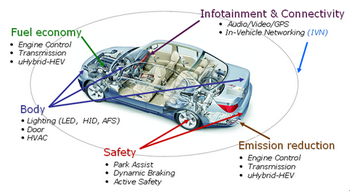 隨(sui)著(zhe)西(xi)方(fang)汽(qi)車(che)市(shi)場(chang)需(xu)求(qiu)的(de)複(fu)蘇(su)以(yi)及(ji)發(fa)展(zhan)中(zhong)經(jing)濟(ji)體(ti)車(che)輛(liang)數(shu)目(mu)的(de)持(chi)續(xu)增(zeng)長(chang)使(shi)燃(ran)料(liao)消(xiao)耗(hao)和(he)汙(wu)染(ran)不(bu)斷(duan)增(zeng)加(jia),政(zheng)府(fu)和(he)製(zhi)造(zao)商(shang)都(dou)在(zai)積(ji)極(ji)探(tan)索(suo)改(gai)善(shan)燃(ran)油(you)經(jing)濟(ji)性(xing)以(yi)節(jie)約(yue)能(neng)源(yuan)、減(jian)少(shao)排(pai)放(fang)的(de)途(tu)徑(jing),汽(qi)車(che)中(zhong)越(yue)來(lai)越(yue)多(duo)的(de)電(dian)子(zi)功(gong)能(neng)也(ye)使(shi)半(ban)導(dao)體(ti)元(yuan)件(jian)在(zai)車(che)輛(liang)中(zhong)的(de)比(bi)重(zhong)不(bu)斷(duan)激(ji)增(zeng)。麵(mian)對(dui)環(huan)保(bao)和(he)豐(feng)富(fu)消(xiao)費(fei)者(zhe)體(ti)驗(yan)的(de)雙(shuang)重(zhong)挑(tiao)戰(zhan),半(ban)導(dao)體(ti)製(zhi)造(zao)商(shang)正(zheng)在(zai)利(li)用(yong)其(qi)技(ji)術(shu)專(zhuan)長(chang)開(kai)發(fa)各(ge)種(zhong)符(fu)合(he)汽(qi)車(che)規(gui)範(fan)的(de)解(jie)決(jue)方(fang)案(an)。