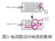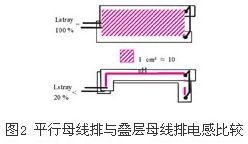 由(you)鄰(lin)近(jin)效(xiao)應(ying)原(yuan)理(li)可(ke)知(zhi),某(mou)一(yi)導(dao)體(ti)的(de)高(gao)頻(pin)電(dian)流(liu)在(zai)鄰(lin)近(jin)的(de)導(dao)體(ti)層(ceng)會(hui)形(xing)成(cheng)輻(fu)射(she)幹(gan)擾(rao)電(dian)流(liu)。對(dui)於(yu)雙(shuang)層(ceng)銅(tong)排(pai),當(dang)電(dian)流(liu)源(yuan)路(lu)徑(jing)與(yu)地(di)平(ping)麵(mian)互(hu)相(xiang)疊(die)層(ceng)並(bing)使(shi)間(jian)距(ju)滿(man)足(zu)絕(jue)緣(yuan)層(ceng)厚(hou)度(du)遠(yuan)小(xiao)於(yu)母(mu)排(pai)寬(kuan)度(du)時(shi),高(gao)頻(pin)電(dian)流(liu)將(jiang)主(zhu)要(yao)分(fen)布(bu)在(zai)兩(liang)塊(kuai)銅(tong)排(pai)相(xiang)臨(lin)近(jin)的(de)兩(liang)個(ge)內(nei)部(bu)平(ping)麵(mian)上(shang),部(bu)分(fen)高(gao)頻(pin)磁(ci)場(chang)可(ke)以(yi)相(xiang)互(hu)抵(di)消(xiao),相(xiang)當(dang)於(yu)等(deng)效(xiao)減(jian)小(xiao)了(le)回(hui)路(lu)電(dian)感(gan)。疊(die)層(ceng)母(mu)線(xian)排(pai)與(yu)平(ping)行(xing)母(mu)線(xian)排(pai)電(dian)感(gan)大(da)小(xiao)比(bi)較(jiao)如(ru)圖(tu)2所示。