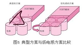 大da功gong率lv器qi中zhong分fen布bu雜za散san電dian感gan的de抑yi製zhi離li不bu開kai緩huan衝chong電dian容rong和he電dian解jie電dian容rong,出chu於yu成cheng本ben考kao慮lv,一yi般ban選xuan用yong鋁lv電dian解jie電dian容rong支zhi撐cheng母mu線xian直zhi流liu電dian壓ya,由you於yu其qi耐nai壓ya等deng級ji低di,需xu要yao大da量liang串chuan並bing聯lian,連lian接jie線xian路lu上shang的de雜za散san電dian感gan會hui造zao成cheng各ge並bing聯lian電dian容rong間jian高gao頻pin電dian流liu分fen布bu不bu均jun勻yun,距ju離li功gong率lv器qi件jian較jiao近jin的de電dian容rong會hui承cheng受shou高gao於yu額e定ding值zhi的de電dian流liu而er急ji劇ju發fa熱re,因yin此ci這zhe兩liang者zhe是shi工gong業ye工gong程cheng應ying用yong中zhong的de主zhu要yao問wen題ti。在zai電dian容rong結jie構gou設she計ji中zhong,主zhu要yao影ying響xiang因yin素su分fen別bie是shi:電容端子設計方向、電容串聯結構設計。圖4分別測量了不同電容端子設計電感的值,圖5給出了典型設計方案和主流低電感設計方案中電容串聯方式的不同。從圖5中可以得出這樣的結論,電容端子的方向對電感有較大影響,而電容采用無環路串聯方式可以極大的降低母排電感。圖6給出了電容端子設計良好時母排電流的有限元分析,由圖6可以看出在母線排表麵電流分布十分均勻,等效作用降低了電感。