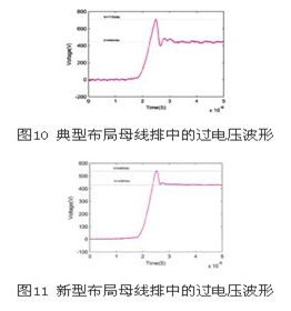 本節主要通過實驗進行典型布局下的母線排igbt過電壓波形與采用優化後布局的比較,如圖9所示。實驗使用80kva/400v變流器係統。圖10和圖11為實驗得到的igbt過電壓波形,其中圖11為采用典型布局的h橋母線排中測得的igbt過電壓波形,圖11為采用優化後布局的母線排中測得的igbt過電壓波形。由圖中可以看出新型母線排布局有良好的抑製過電壓效果。