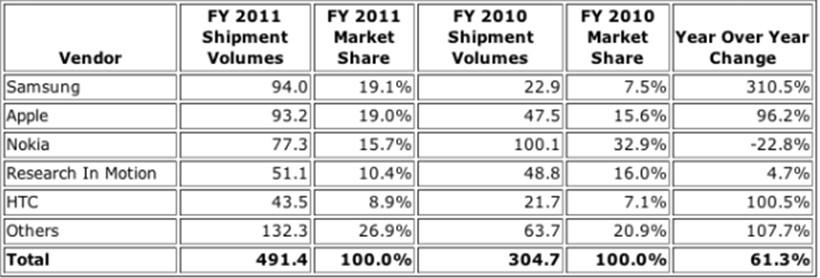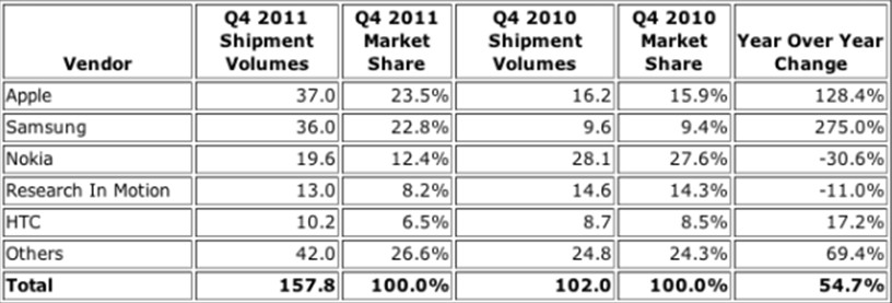 2011第四季度全球智能機銷量同比增55%
