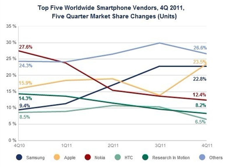 2011年全球前五大手機廠商市場份額變化情況