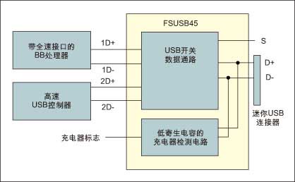 隨著目前的市場趨勢向單一USB充電器/數據端口的轉變,特殊應用USB開關已經成為帶充電器檢測功能的手機設計中的一種常規配置。圖2是這種開關應用的一個範例。