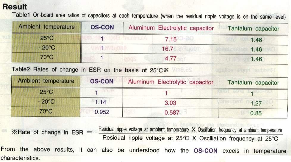 而上圖的表格則表明了,在L/C部分使用不同種類電容的情況下,這個電路中漣波電壓的表現情況。可以看出,具有LOW ESR性能的鋁固體聚合物導體電容(左邊),其消除漣波電壓的性能最強,鉭二氧化錳電容(右邊)性能次之,鋁電解液電容(中間)表現最差。同時最後的數值還將受溫度影響,這點我們還將在後麵詳細說明。