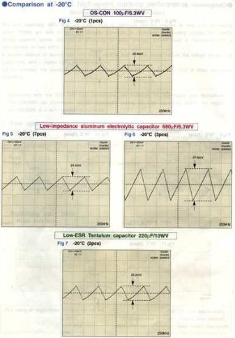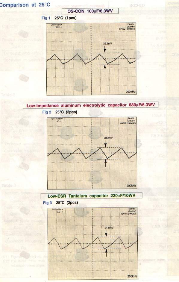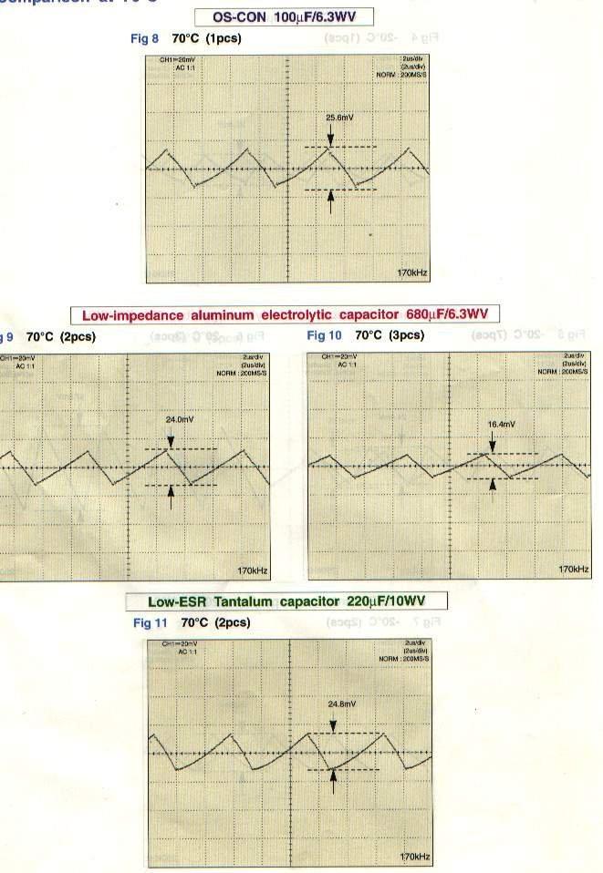 上圖代表25攝氏度下,三種電容降低漣波電壓的能力(電路可以以上一章節中的電路圖為參考)。其中第一個表格所使用的OSCON SVP鋁固體聚合物導體電容(1顆,100μF,ESR=40毫歐姆) ),第二個表格所使用的是低阻抗鋁電解液電容(3顆並聯),第三個表格使用的是低阻抗鉭電容(2顆並聯)。