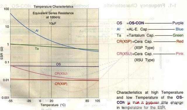 從以上分析我們不難看出,鋁電解液電容的ESR值受溫度影響是極其明顯的。上麵的圖表則直接畫出了不同種類電容,在不同溫度狀態下的ESR曲線。其中鋁電解液電容(藍色線)隨溫度(Y軸)的增加,ESR值(X軸)降低明顯。而鋁固體聚合物導體電容(紫色線)和鉭電容(綠色線)以及高檔陶瓷電容(紅色線)則近似於直線,其ESR值受溫度影響不大。而普通陶瓷電容(粉紅線)則受溫度影響較大。