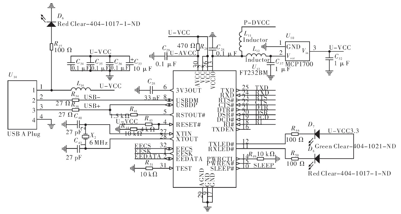 無線傳感器網絡由大量節點組成,這些節點按一定協議將采集的數據進行融合、傳輸,最終將數據傳送到個人電腦上進行處理和觀察,同時節點工作需要將特定的程序寫入Flash中。目前個人電腦最常用的接口為USB,而微處理器使用USART接口,為實現兩種接口之間轉換,節點使用FT232BM芯片作為轉換芯片。FT232BM是一種單片USB到異步串口轉換芯片,支持全握手和調製解調接口信號,在TTL級數據傳輸速度範圍為300 bit·s-1~3 Mbit·s-1.芯片通過USB總線供電,工作電壓為4.35~5.25 V,采用外部6 MHz時鍾。USB PID、序列號和產品信息可以保存在外部EEPROM中。USB通信模塊接口如圖5所示。