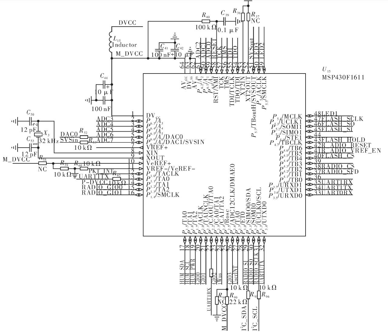 微處理器是無線傳感器節點的核心,傳感器數據的數據處理,串行口以及無線模塊的傳輸與控製均需要微處理器的參與。節點微處理器TI公司的16為超低功耗MSP430F1611.該微處理器工作電壓為1.8~3.6 V,在RAM數據保持方式下耗電僅為0.2μA,在激活工作1 MHz的情況下為330μA,可以工作在5中低功耗模式,喚醒時間<6μm.Flash大小為48 kB,RAM大小為10 kB.芯片內部有16位定時器Timer_A和Timer_B具有捕獲/比較功能;大量的捕獲/比較寄存器可用於事件計數、時序發生等;多功能串口(USART)可以實現異步、同步和I2C串行通信,可以方便地實現多級通信的應用;具有較多的I/O端口,最多達6×8條I/O口線,P1、P2口還可以接收外部上升或下降沿的中斷輸入;12位A/D轉換器有較高的轉換速率,最高可達200 kbit·s-1,能滿足大多數數據采集的應用。微處理器模塊如圖6所示。溫度濕度傳感器連接P1口5、6、7管腳,無線模塊SPI接在P3口1、2、3和P4.4管腳,USB通信模塊數據線連接到P3口6、7管腳。其他管腳分別用於控製和擴展接口。外部晶振大小為32MHz。