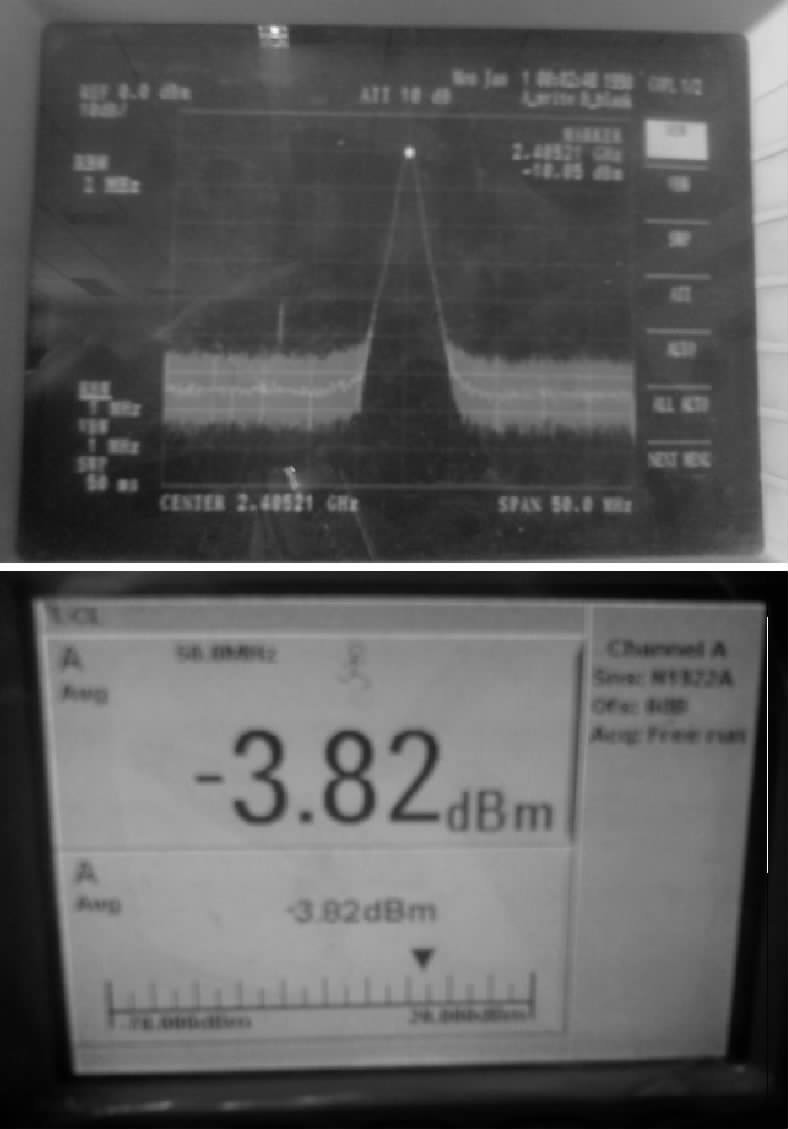 為對設計的節點功能進行驗證,首先使用IAR集成開發環境編寫CC2420的測試程序,通過JTAG將程序燒入Flash,經過檢測,射頻部分較好地滿足了預期。芯片工作頻帶範圍為2.4~2.48 GHz,發射功率為0 dBm.經過頻譜儀和頻率計驗證設計符合要求,驗證結果如圖9所示。