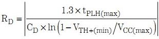 當總線電壓變為正(VBus > 200 mV)時,RX1 輸出變為高,其驅動 DR2 輸出為高,並通過 RD 對 CD 緩慢充電。必須正確計算最小時間常量(RD × CD),以使最大電源電壓 VCC(max) 和最小正反相器輸入閾值VTH+(min) 時,延遲時間tD 超過驅動器最大低到高傳播延遲 tPLH(max),即超出 30%。例如,電容為 CD = 100 Pf 時,RD 的要求電阻值為: