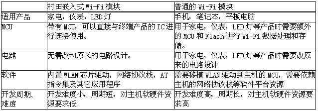 用於通訊產品的Wi-Fi模塊,因為終端產品,如手機,筆記本具有強大的CPU和Flash進行數據處理和存儲,因此在使用Wi-Fi時不需要額外的MCU。但是用於家電,儀表,LED燈等產品的Wi-Fi模塊,因為終端產品的MCU和Flash都無法支持Wi-Fi的功能,因此需要額外的MCU和Flash進行數據處理和存儲。為在這些產品上的應用提供方便,簡單的解決方案,村田開發了帶有MCU的Wi-Fi模塊-嵌入式Wi-Fi模塊。