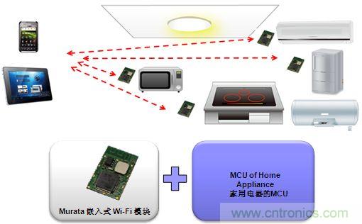 隻需加村田的嵌入式Wi-Fi模塊,就可以用手中的手機或者Pad隨時隨地控製家中的電器。