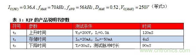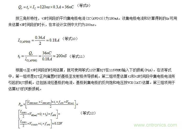集電極反向恢複電荷(Qr)數量可用來估算開關損耗時間段t3。根據BJT產品說明書,參數Qr的計算結果為36nC。