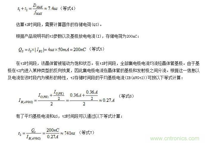 估算晶體管損耗,需要估算圖4中所示的各個時間段。t1時間段是最大占空比的時長,對於本設計示例而言大約是7.4us。