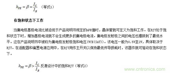 zaijijifashejijiedianchuyuzhengxiangpianzhi,erjidianjizhifashejilujingweipianzhishi,zhekedakaihongliuzhaji,yunxudianliuliudong。lianjiezhijidianjidezhengpianzhihuixiyinziyoudianziliuxiangjidianjiduan,zaiN材料中形成電子匱乏。這可吸引來自基極的電子,將其耗盡在N材料中。現在電流就可流經集電極和發射極的耗盡層,形成完整電路。集電極電流(IC)的數量可能會比基極電流(IB)多好幾個數量級。IC與IB之間的比值一般稱為晶體管的DC電流增益。在產品說明書中也可表達為Beta(β)或hFE。注意,在晶體管產品說明書中,該比值在特定條件下給出,可能會有明顯的變化。