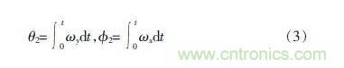 若使用陀螺儀來測量平衡車姿態角度,設陀螺儀測量載體相對慣性坐標係的x、y、z 三軸旋轉角速度分別為ωx、ωy、 ωz。並定義0 時刻平衡車直立靜止。可得到俯仰角θ2和橫滾角φ2估計值與ωx、ωy之間的關係如式3 所示: