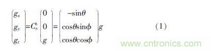 其中,Cbn為慣性坐標係到載體坐標係的變換矩陣;θ 為俯仰角;φ為橫滾角;g 為重力加速度; 可以通過測量重力加速度分量gx、gy、gz,計算出平衡車俯仰角θ1和橫滾角φ1估計值