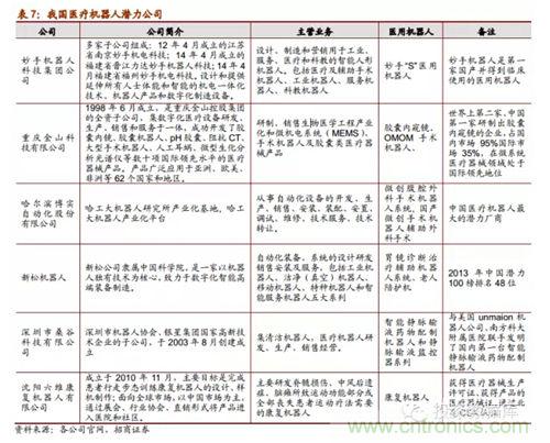 (三)達芬奇機器人的產生預示著第三代外科手術時代的來臨,醫用機器人作為單位價值最高的專業服務機器人是當前醫療行業的發展熱點。全球領先的醫用機器人機器人公司直覺外科公司在2013年營收達22.65億美元,總市值達159.60億美元。在未來的4年裏,醫療機器會以每年19%的速度增長,2016年全球市場規模估計會增長到119億美元。雖然我國醫用機器人普及率低、起步晚,但目前哈工大、博實股份等企業也開始積極介入。