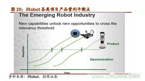 iRobot的de產chan品pin戰zhan略lve布bu局ju以yi家jia居ju清qing潔jie機ji器qi人ren為wei主zhu。家jia居ju清qing潔jie機ji器qi人ren所suo需xu投tou入ru成cheng本ben較jiao其qi它ta產chan品pin低di,最zui早zao成cheng為wei現xian金jin牛niu,為wei新xin研yan發fa的de更geng高gao級ji產chan品pin提ti供gong資zi金jin支zhi持chi。目mu前qian遠yuan程cheng視shi頻pin機ji器qi人ren成cheng功gong研yan製zhi,開kai始shi進jin入ru營ying銷xiao階jie段duan。