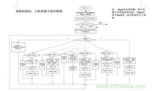 係統框圖如圖3所示,主控循環程序每隔一個采樣周期從FPGA接jie口kou中zhong讀du取qu各ge個ge傳chuan感gan器qi的de數shu值zhi,並bing經jing過guo處chu理li後hou獲huo得de小xiao車che的de運yun行xing狀zhuang態tai,根gen據ju小xiao車che的de當dang前qian狀zhuang態tai采cai取qu相xiang應ying的de控kong製zhi算suan法fa計ji算suan出chu電dian機ji所suo需xu的de控kong製zhi電dian壓ya值zhi,進jin而er,該gai控kong製zhi電dian壓ya值zhi經jing過guoPMWchulihoushuchudaoxiaochequdongdianji,shixiaocheanzhaoxiwangdeguilvyundong。weileshichengxuliuchengqingxijianjie,kuangtuzhongyiyigebiaozhixinhaolaijiluxiaochesuoyunxingdejieduan,kongzhiqizegenjuxiaochesuochudeyunxingjieduanjinxingxiangyingdekongzhi。