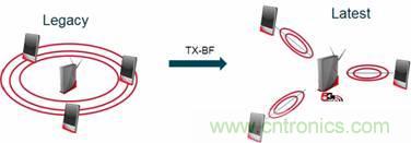 圖1. 借助 802.11ac(和802.11n)波束成形技術,無論周邊有多少設備,集線器或AP都能讓無線信號直接傳向需要信號的設備。與此形成對比的是,傳統Wi-Fi技術隻能在設定區域輻射無線信號,而該區域內的任何設備都能接收該信號。