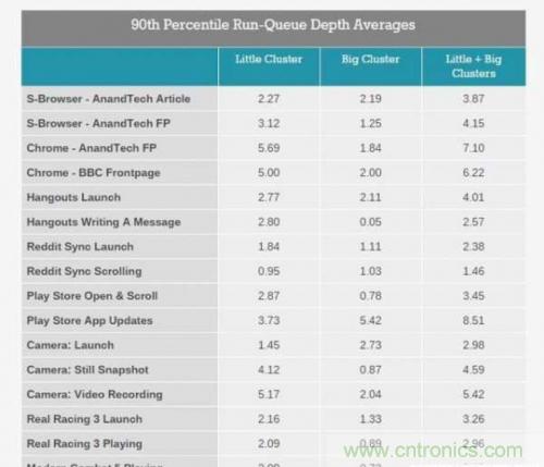 首先,測試人員挑選了一些比較常見的任務,包括在Hangouts中編輯信息、刷新網站、打開攝像頭、在Google Play商店安裝應用、玩遊戲等等。測試的目標很簡單,是核心越多越好、還是核心主頻越高越好。就像許多八核處理器一樣,內置的Cortex-A57核心負責處理那些要求比較高的任務,而Cortex-A53則負責那些更平常的任務。測試團隊未來將對更多的處理器進行測試,比如聯發科Helio X10這樣配備了八個A53s核心的十核處理器。